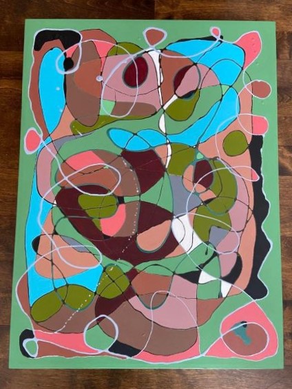 Avant d’aller plus loin, je précise que j’ai fait couler du vernis à ongle sur cette toile. Ce fut le point de départ. Le vernis, juste assez épais, coule en créant sur la toile une belle ligne fine, sans flaque ni éclaboussure. J’ai fait des mouvements de la main pour obtenir que les lignes deviennent des boucles. J’ai utilisé deux ou trois couleurs de vernis. Dans les formes obtenues par le croisement des lignes, et fidèle à mon incontournable habitude, j’ai appliqué de la couleur. Des couleurs de terre, du bleu, du vert, du rouge vin, un rouge rosâtre…